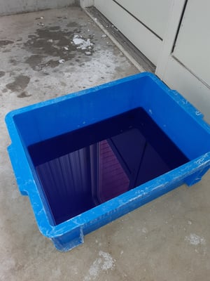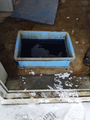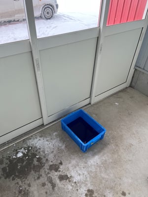 屋外に踏込槽を設置すると、雪が入って液が薄まってしまうため、外扉と内扉の間のスペースや農場処理室に入ってすぐの場所に設置しています。外気温が-20℃でも扉一枚隔てることで畜舎内は-10℃までしか下がらないため、屋内入口に設置することで原液使用量を節約することができます。玄関以外にも牛舎内のあらゆる場所に踏込槽が設置されていました。