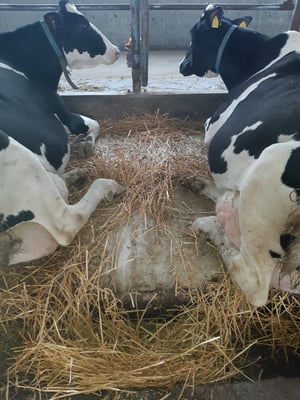 牛床マットの上にプロテクトVAを一日1袋散布した後、その上から麦稈を敷いています。